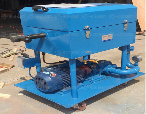 BASY板框?yàn)V油機(jī)是由齒輪輪泵,濾清器,安全閥,回油閥,濾床,后支架,底盤,拉桿,連軸器,以及電動機(jī)等部件組成。齒輪泵,連軸器以及電動機(jī)安裝在底盤上,濾請器安裝在齒輪泵的前側(cè)。在濾清器上裝有回油閥,濾床安裝在齒輪泵的上方,其中濾板框順序交替組成過濾室。濾紙夾在濾板和濾框的中間。進(jìn)出油口膠管連接在進(jìn)出管接頭上,當(dāng)油液從濾清器進(jìn)油口處被吸入,通過濾清器排除掉較大的顆粒雜志后,在進(jìn)入齒輪泵。齒輪泵在電機(jī)的帶動下旋轉(zhuǎn)產(chǎn)生擠壓力,使油液進(jìn)入濾床,滲透出濾紙將油液雜志濾凈。然后將油液從出油管排除出。當(dāng)油壓超過規(guī)定值時。安全閥就立刻啟動,使油液在油泵中自行循環(huán),油壓不再上升,以確保設(shè)備的安全,油樣閥供取油樣進(jìn)行耐壓及其他理化性能的實(shí)驗(yàn)。本機(jī)采用底盤滾輪結(jié)構(gòu)。可以通過人力拉動拉桿移動。
